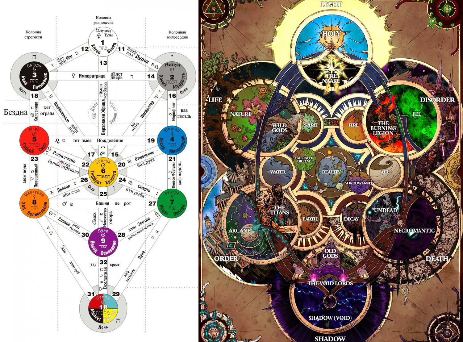 Самыми древними примерами опухания сеттинга оказываются предсказуемо каббала (опухание Ветхого Завета) и гностицизм (Нового). Оттуда и пошли многомирье, несовершенство Бога, оккультное отношение к вере. Это следствия осмысления Божественных категорий — падшим умом без связи с Церковью. Современный подвижник, иеромонах Рафаил (Карелин), раскрывает причины этого явление:
