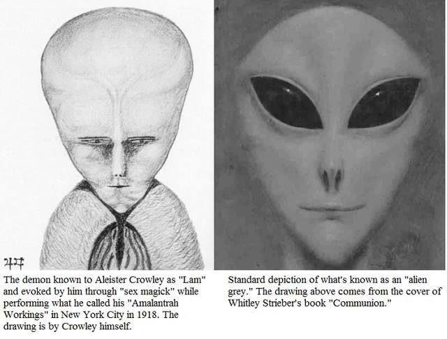 В связи с файлами Эпштейна нашел еще одну зацепку. Наш Фейри (а это буквально прототип пришельцев, см. статью по ссылке) любил закатывать оргии. Изветнейший оккультист Алистер Кроули в свою очередь занимался идентичными занятиями с целями исполнения оккультных ритуалов. Вот кого он нарисовал после очередного «видения»: см. иллюстрацию к посту.